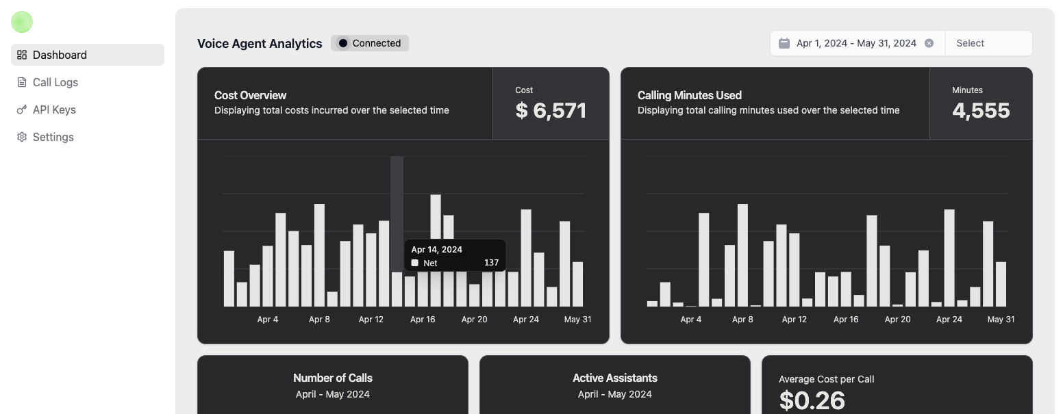 Track essential metrics like voice agent activity and cost analytics in one place