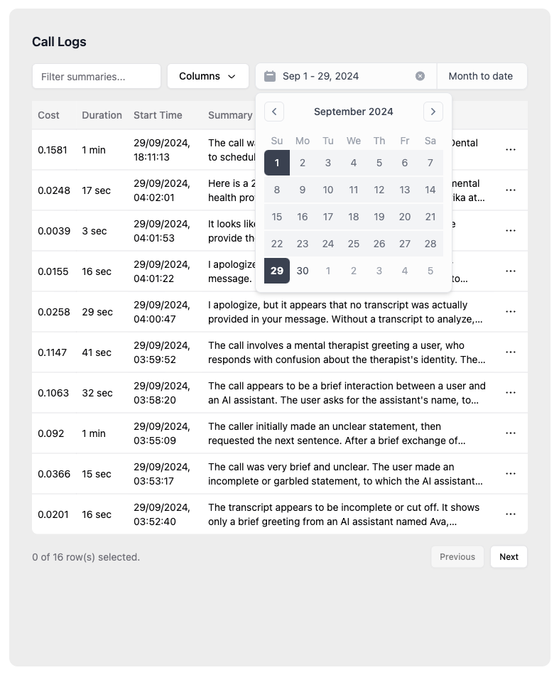 Easily search and filter call logs across multiple AI assistants